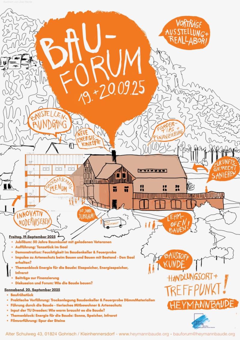 Mit dem BauForum Heymannbaude starten wir im kommenden September einen neuen und zukunftsweisenden Abschnitt für die Baude. Die Heymannbaude steht nicht nur für Geschichte, sondern auch für bauliches Potenzial: als BestandsGebäude für eine sinnvolle Modernisierung und WeiterEntwicklung, als wachsender Kultur- und Begegnungsort, als Modellprojekt für nachhaltiges Bauen im ländlichen Raum und als Ort, an dem neue Allianzen zwischen Handwerk, LebensPraxis, Zivilgesellschaft und Kunst entstehen können.
